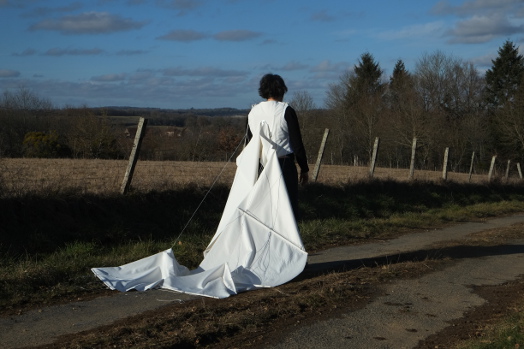 Elle a été réalisée sur Tinos, une île grecque aux abords de la côte. Vêtued'un vêtement de chantier couvert de plumes blanches, je tente de prendre la posture d'un envol planant pendant quelques minutes. Le